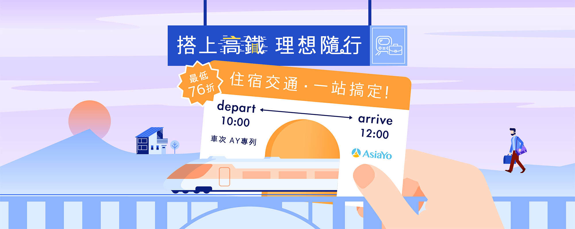 AsiaYo 住宿綁高鐵套裝行程的頁面主視覺,車票及列車元素讓觀看者可以快速聯想到高鐵主題,使用藍紫色想表達專業商務的形象,並用橘色去點亮整個視覺。