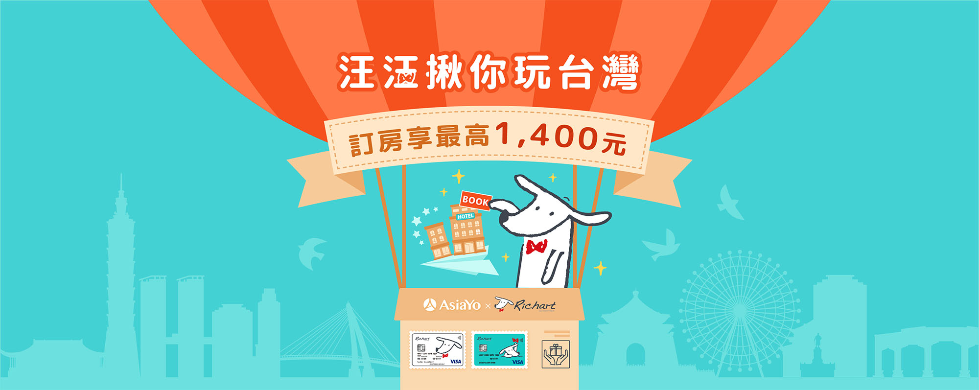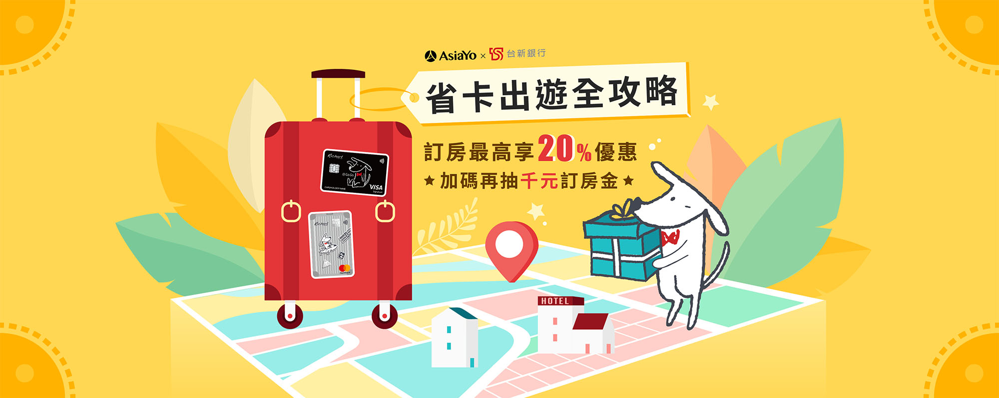在 AsiaYo 訂房刷台新銀行的信用卡能夠享有優惠的頁面主視覺設計,設計上使用黃色為主體搭配台新的狗狗吉祥物,想呈現愉快出遊的氛圍。