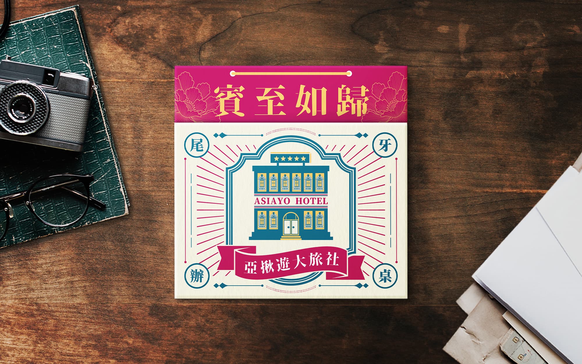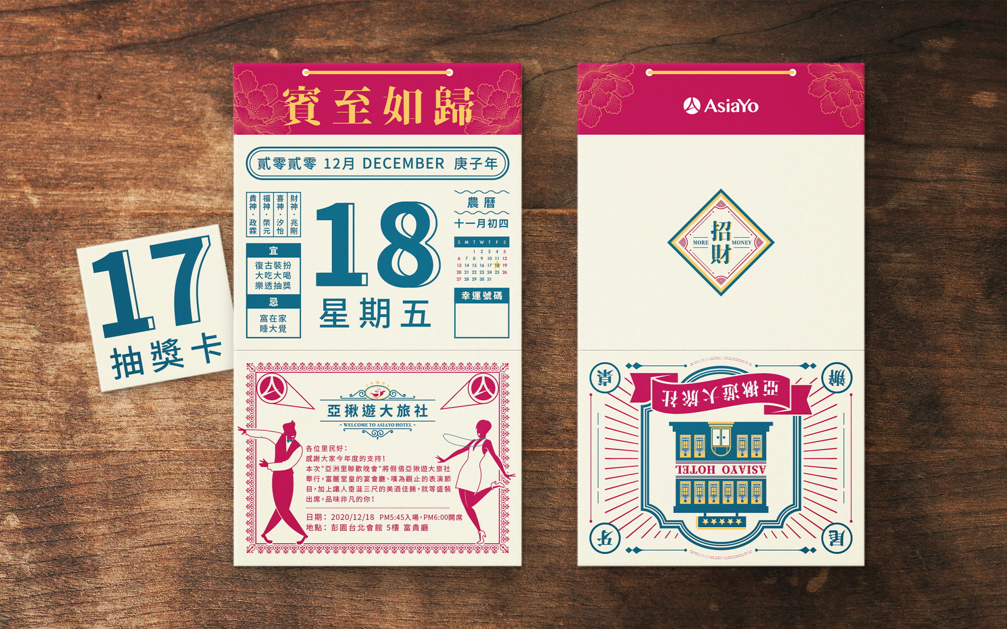 AsiaYo 2020的尾牙邀請卡,將 AsiaYo 包裝成『亞揪遊大旅社』,除因應復古的主題外也傳達我們是與旅遊訂房相關的企業,將邀請卡做成台灣傳統日曆的意向,顏色使用桃紅及深藍為主色並搭配底色米黃呈現復古的台灣風情。