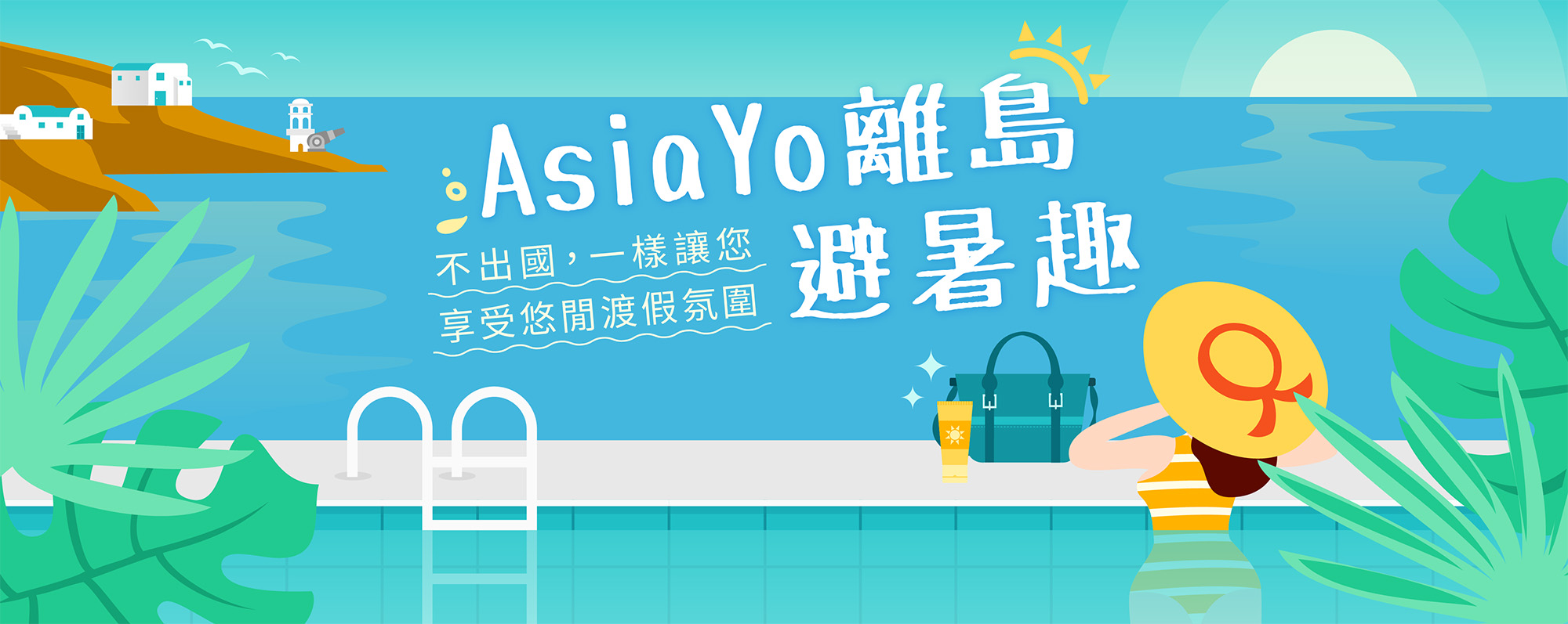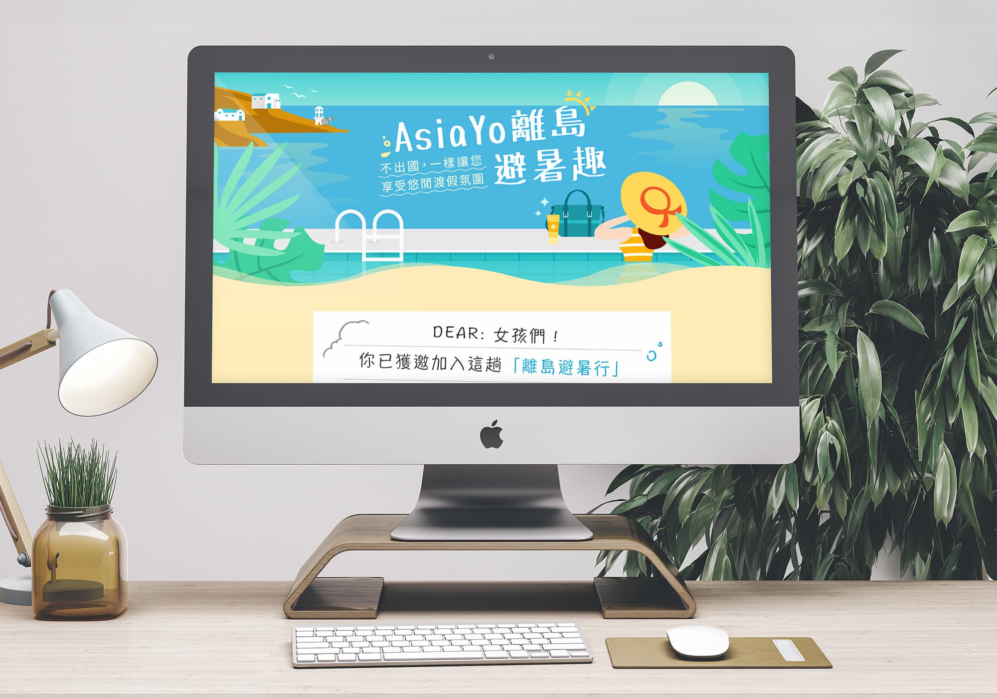 主視覺設計成女孩在飯店無邊際泳池看著大海的意向,希望能給人夏日清涼的感受,並且讓人聯想到主題與海島相關,並將此活動與 AsiaYo 聯名的夏日品牌禮品也呈現在主視覺一角;除了主視覺的設計外也規劃切版該活動的Landing Page頁面。