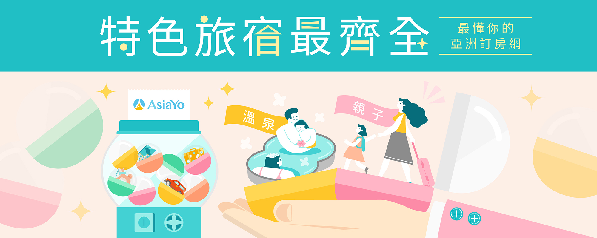 AsiaYo 的”特色旅宿最齊全”的主視覺,扭蛋機裡每個扭蛋都代表不同的特色旅宿,而已經扭出來的兩顆扭蛋則代表當其主打的特色旅宿-溫泉、親子。