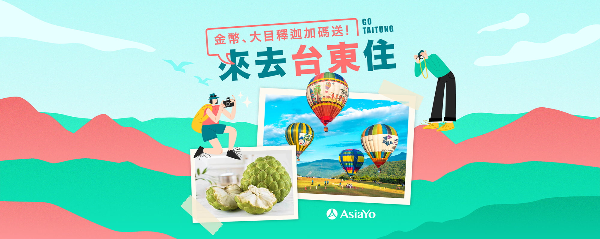 活動期間於 AsiaYo 下訂台東旅宿,並回填活動登記表單,除了能獲得台東金幣與釋迦禮盒外,還加碼抽搭乘熱氣球的資格。 因活動主推的地點為台東,因此做出群山環繞著旅客的自然意象,並用真實的釋迦與熱氣球照片結合插圖的設計,配色上使用紅與綠的撞色,希望能讓設計更加耐看。