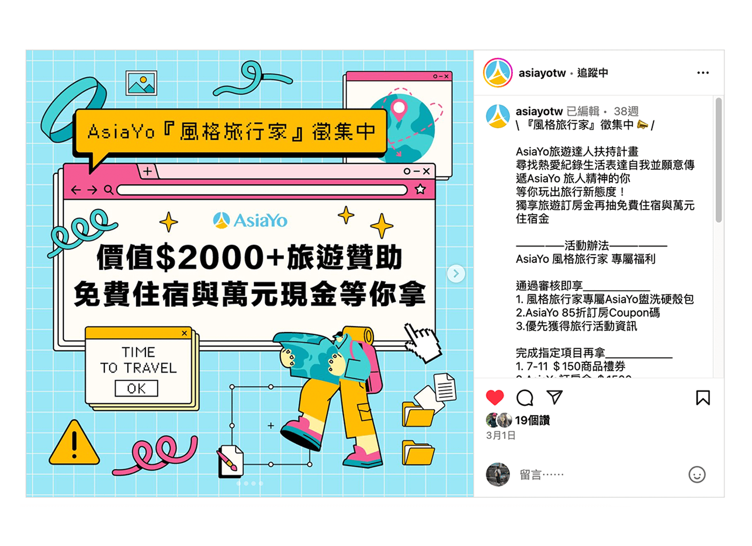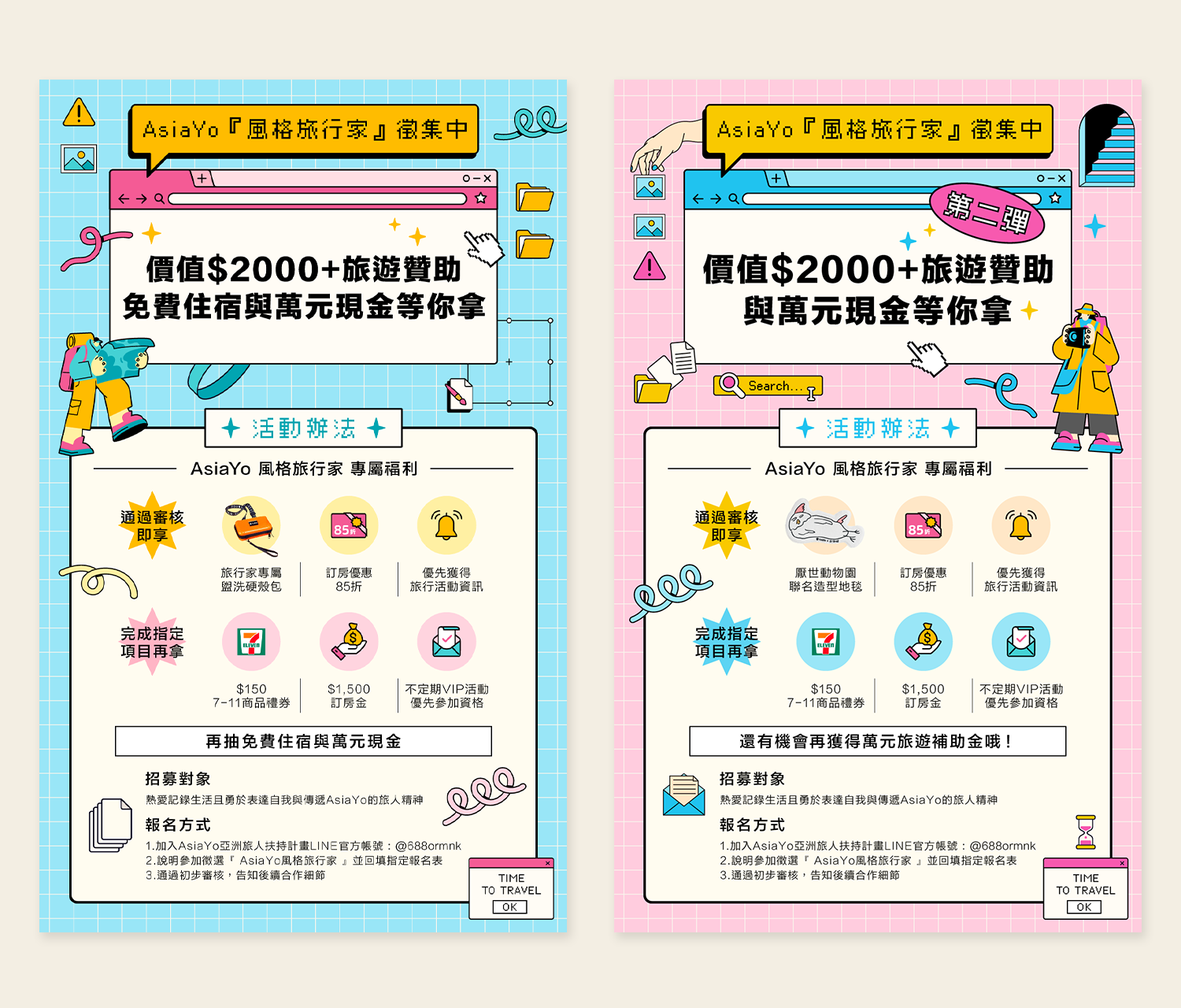 AsiaYo 2024 旅遊達人扶持計畫,透過給予好禮或優惠等誘因,召集旅遊類型KOL,讓KOL固定替AsiaYo曝光的互惠合作專案。 因為是線上的徵集活動,所以視覺上用帶有復古感的網頁元素去製作,並用活潑的色彩去搭配。