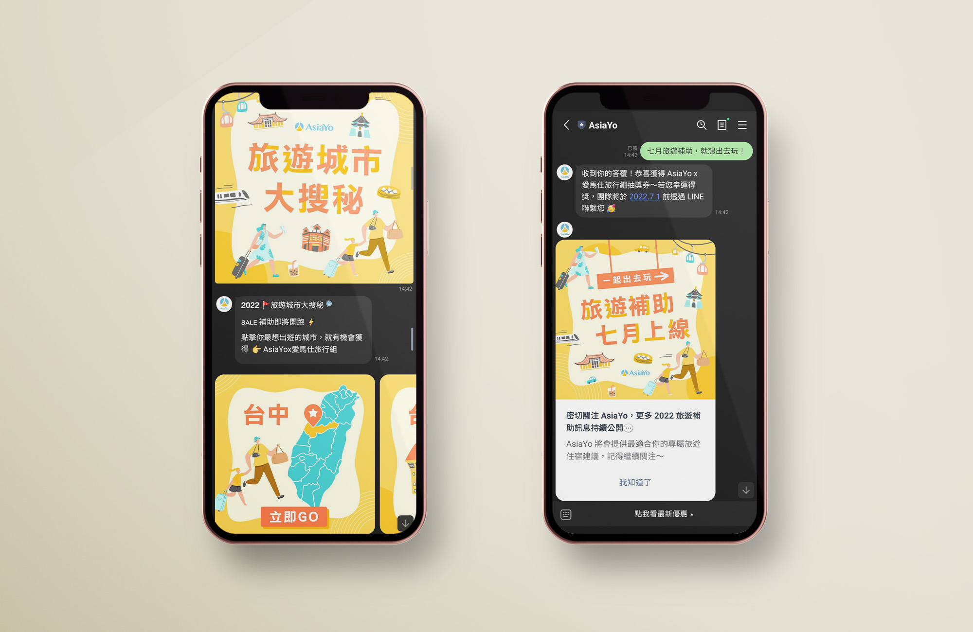旅遊補助上線前於LINE做的預熱活動,使用明亮的黃橘配色,讓人產生歡快、期待的感覺,目的為分析使用者對哪些城市的旅遊意願高,待活動上線後,可以做比較精準的分眾推播。