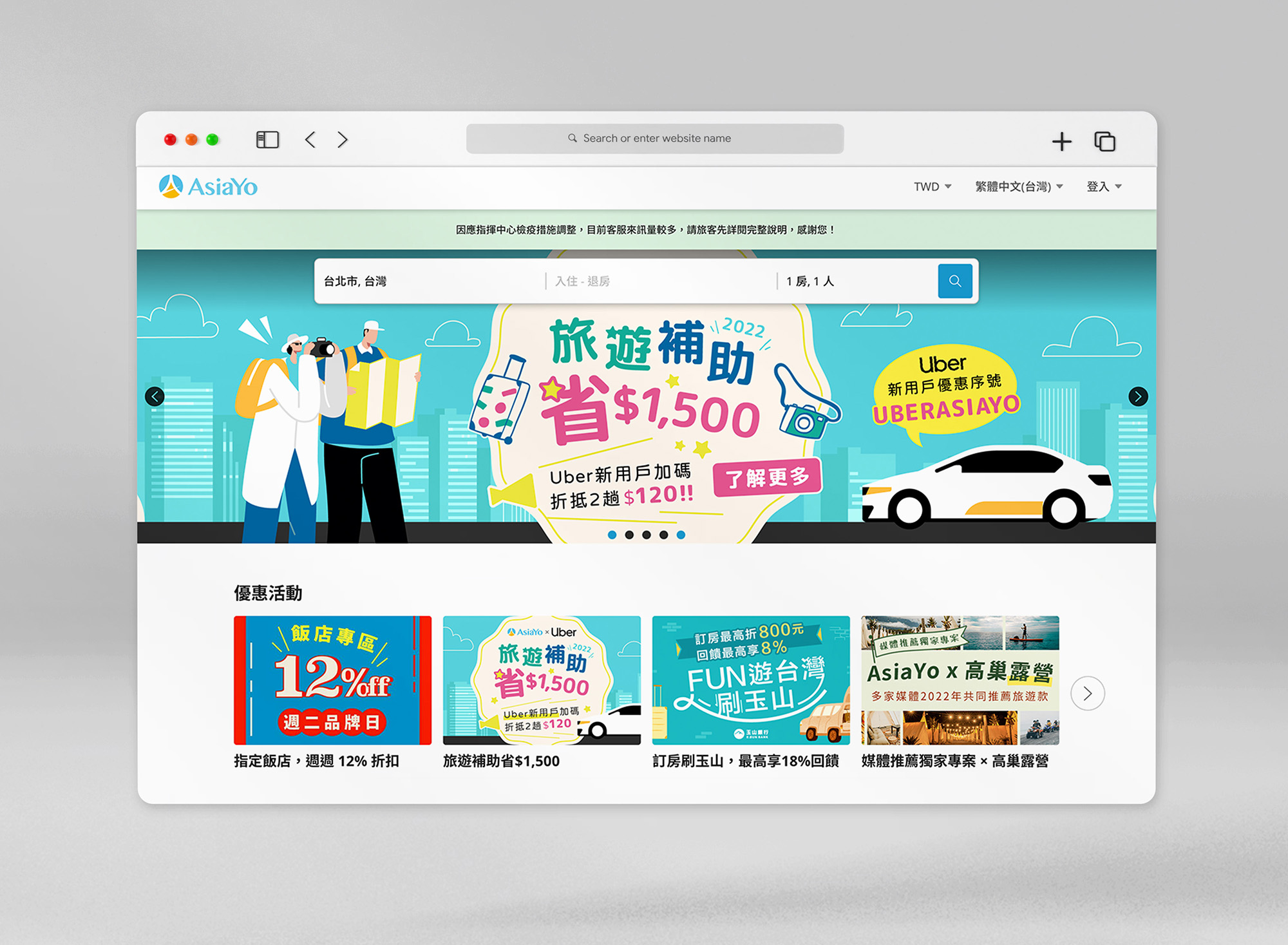 而為搭上這波國旅出遊熱潮,AsiaYo 與 Uber 聯合加碼,拿訂房優惠外還能領乘車金。