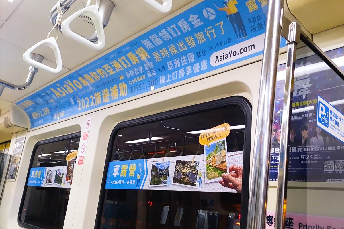 捷運的窗戶玻璃貼,使用 AsiaYo 的特色旅宿照片去設計並強調省1300元的優惠。