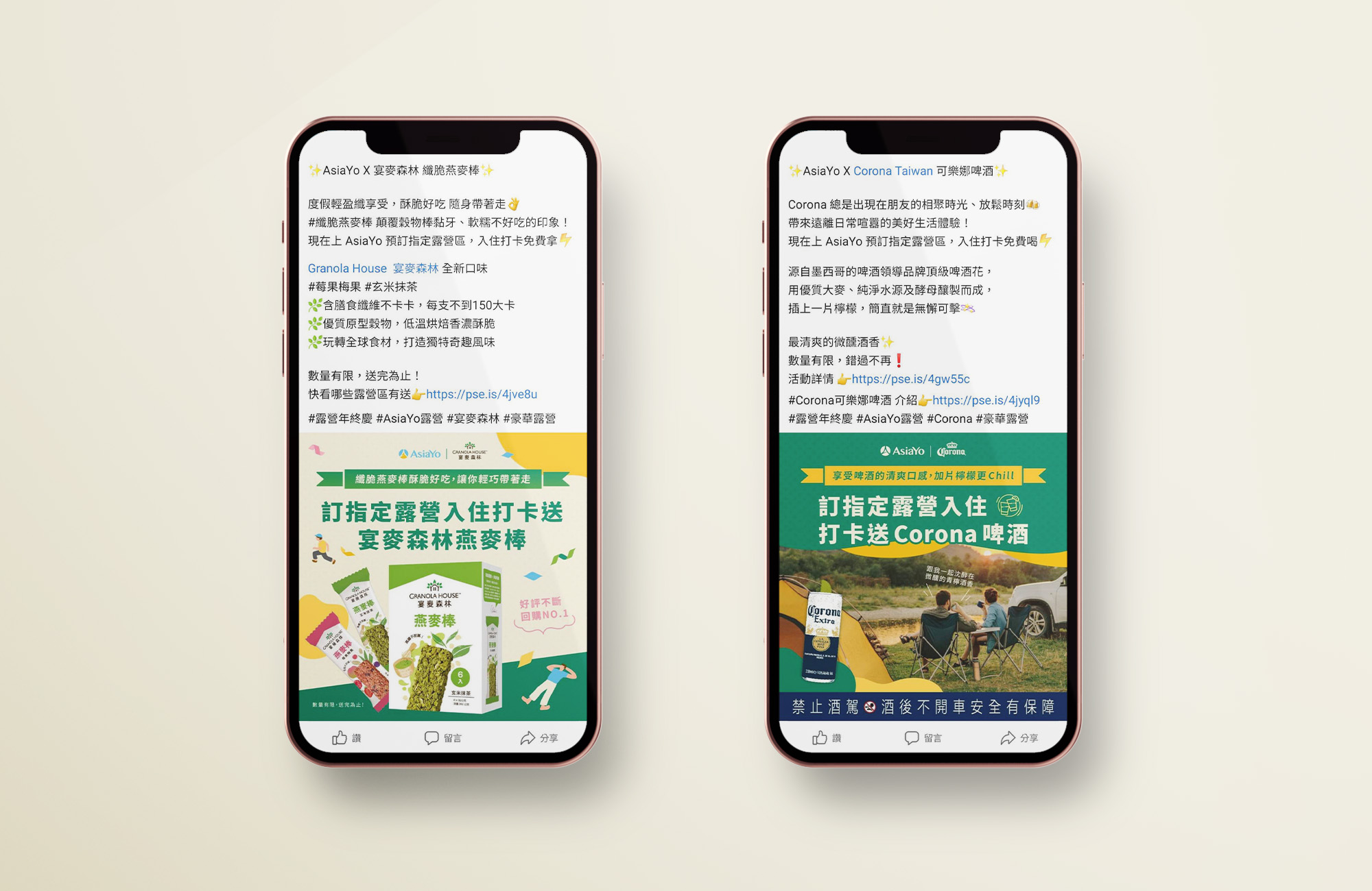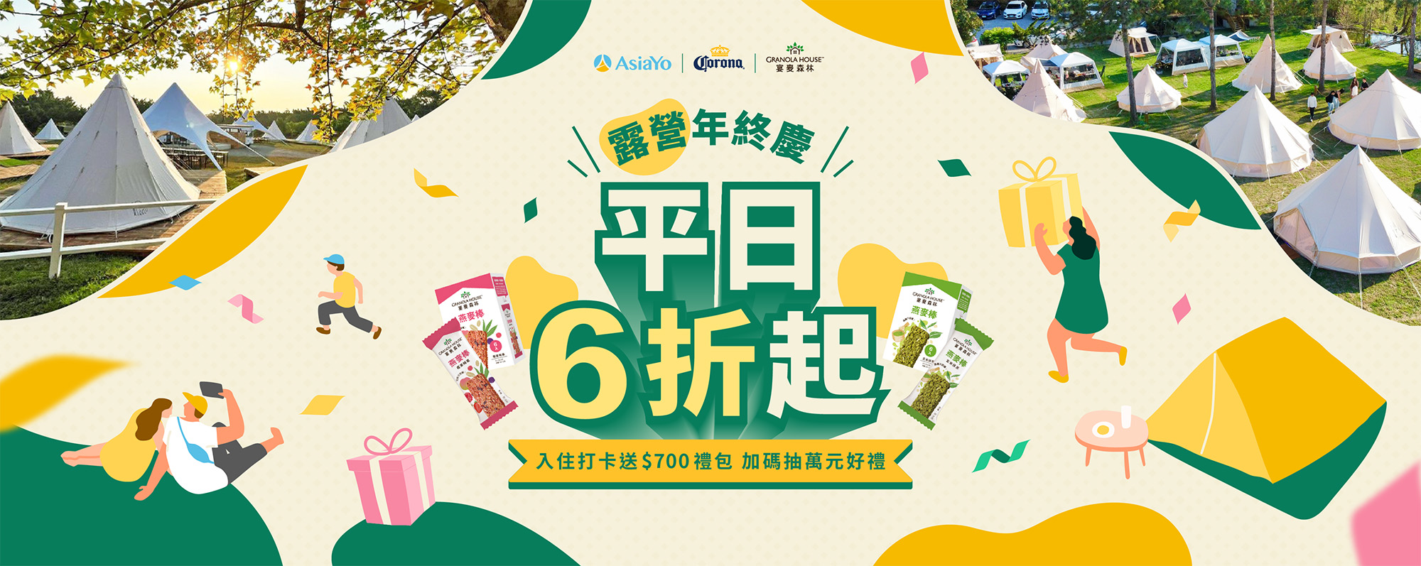 所合作的露營活動,透過訂房送禮的方式,希望增加消費者平日預定的誘因。視覺標題強調折數,用營區的照片搭配遊玩小人的插圖外,再加上飛舞的彩帶讓視覺增添折扣感。