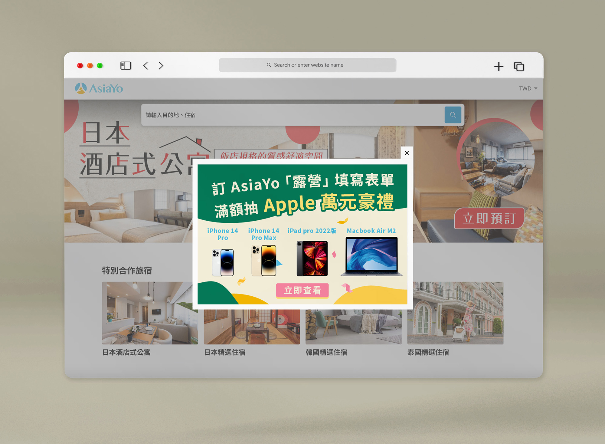 此檔露營活動除了訂房送禮外,登記還能抽好禮Apple等大獎,此為抽獎活動的官網彈窗推播