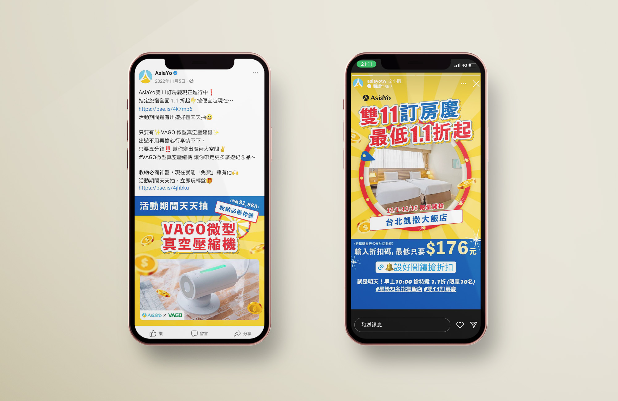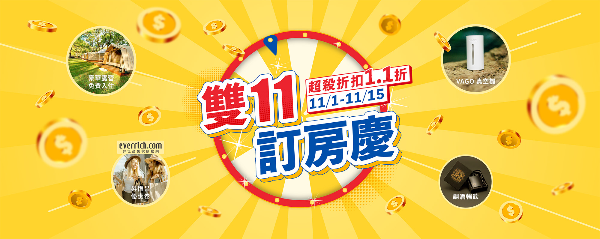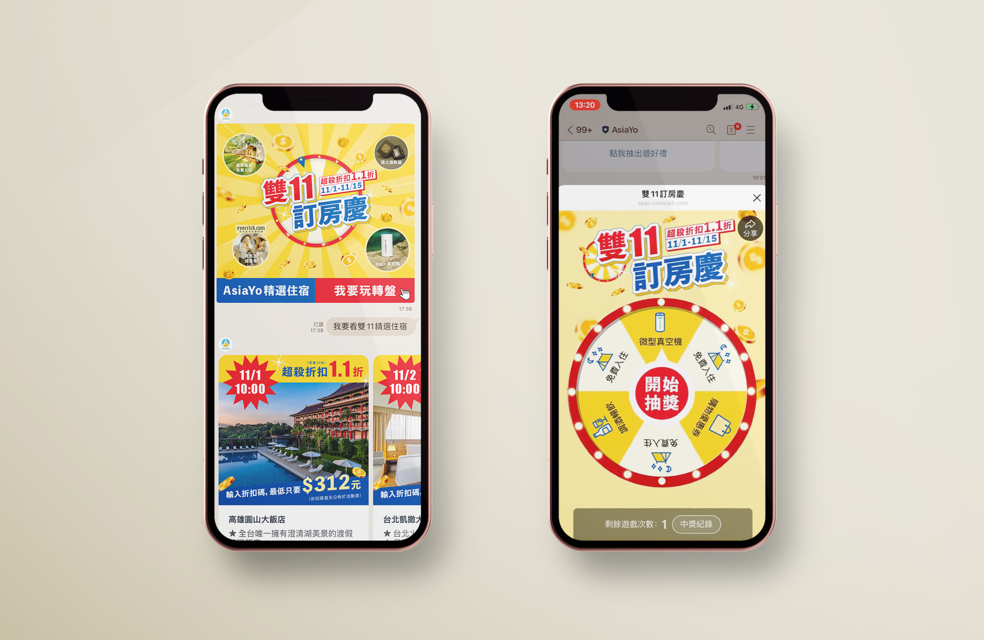 AsiaYo 因應年末最大的消費檔期所推出的雙11活動,活動除了每日的下殺旅宿搶購外,在LINE上也可以透過轉盤抽大獎,因此主視覺以轉盤為意象,主色用亮黃色及紅色搭配四散的金幣做出促銷感。