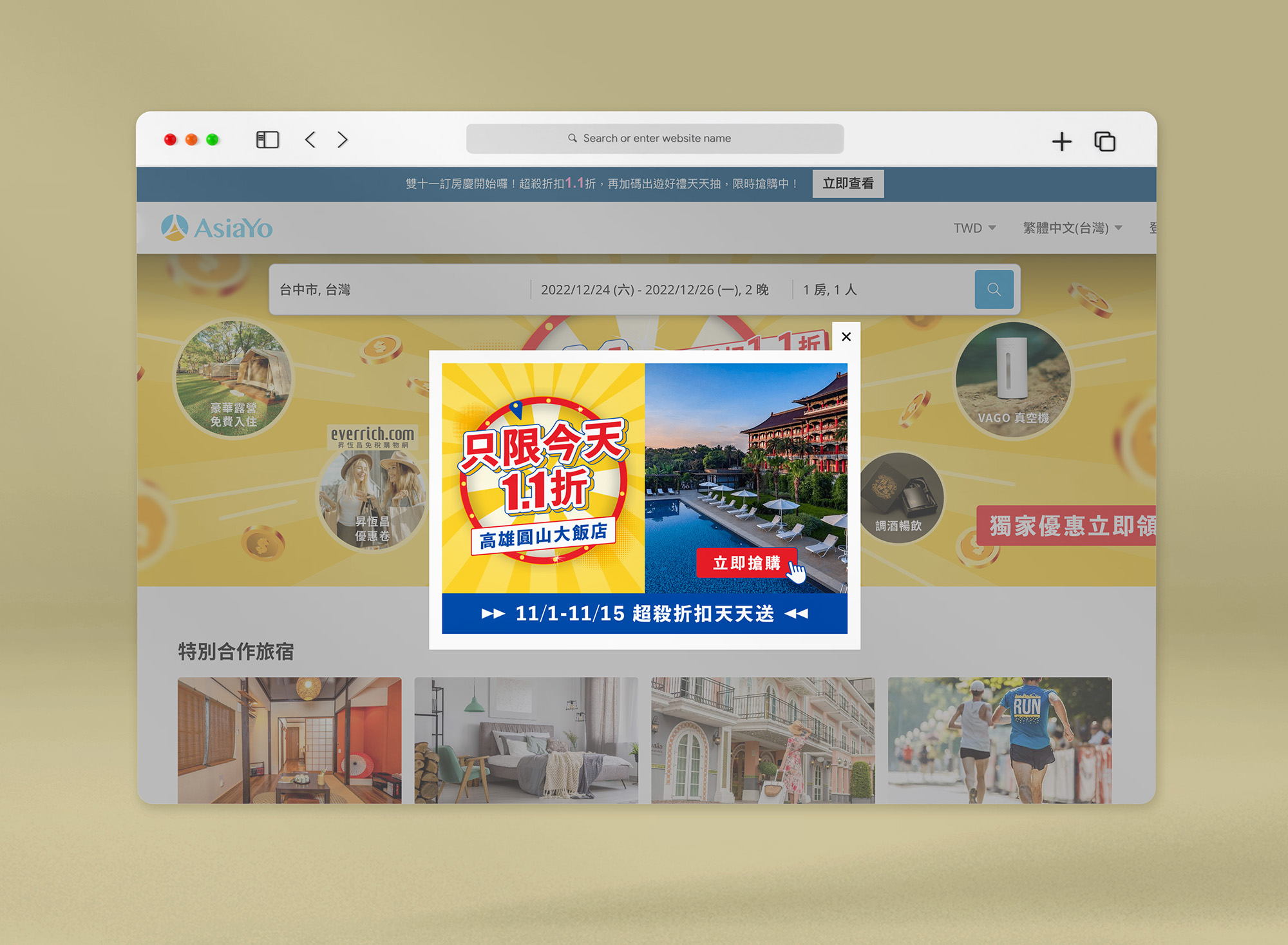 活動期間,官網每日的1.1折旅宿彈窗推播