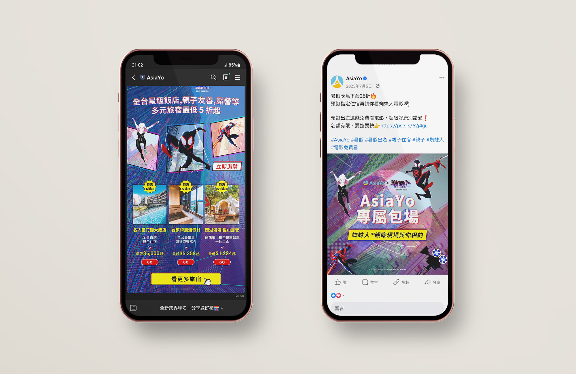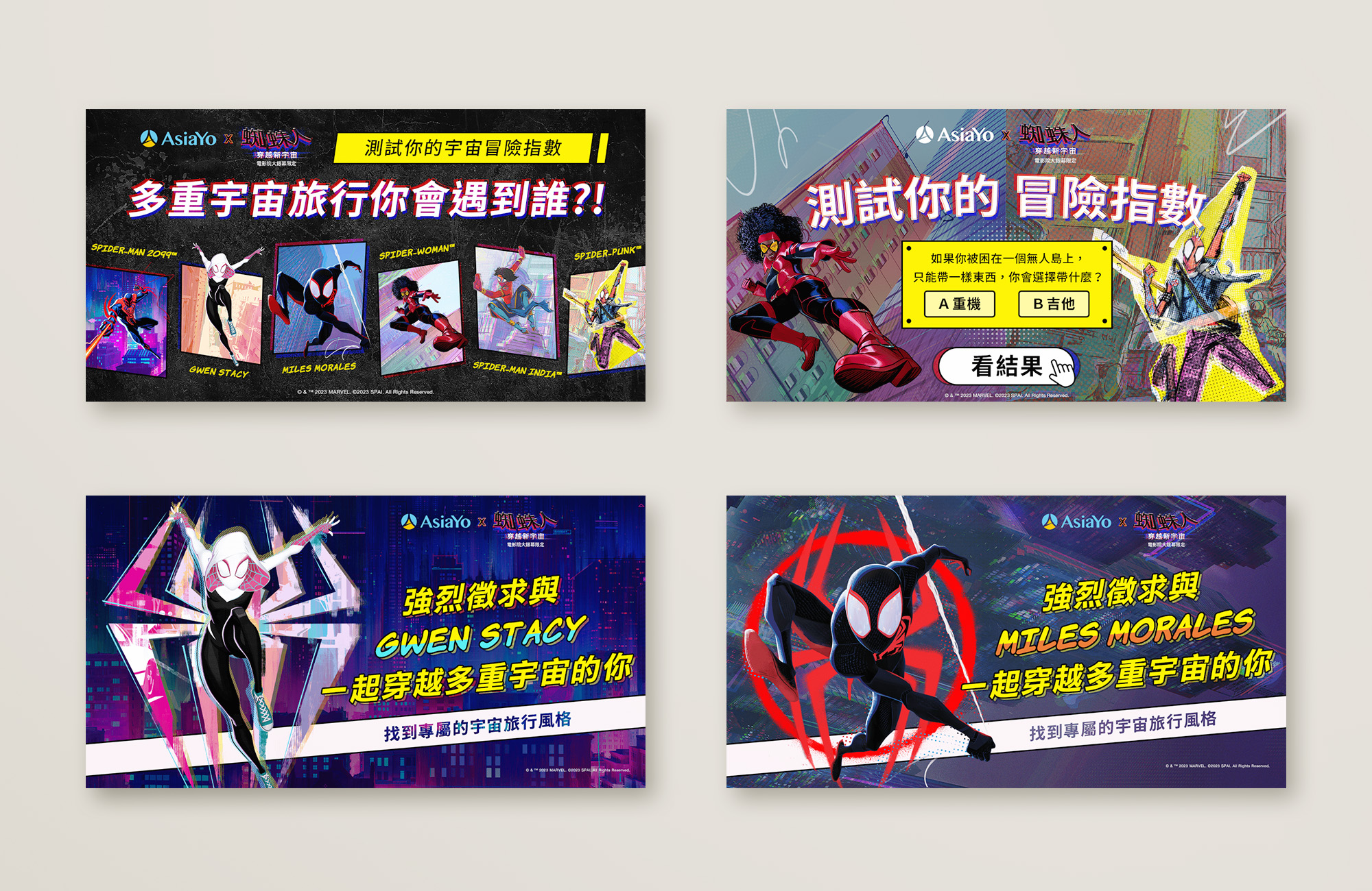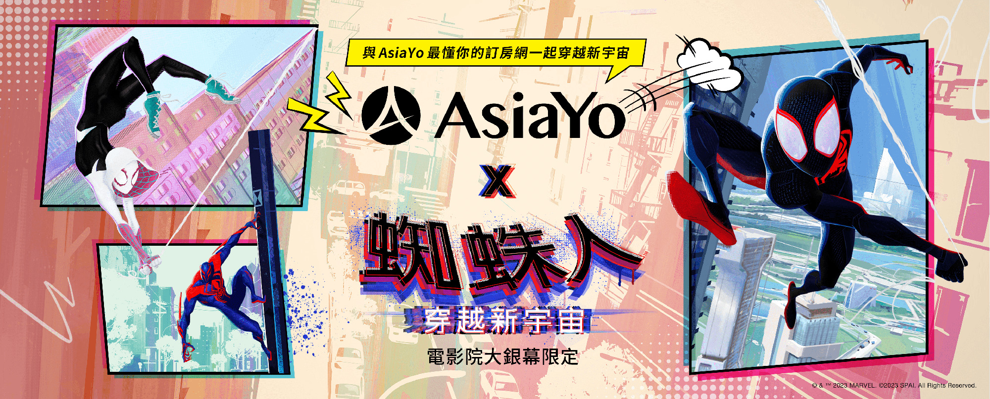 2023年,AsiaYo 與 蜘蛛人™:穿越新宇宙 攜手合作,以蜘蛛人™穿越多重宇宙為主軸,包裝成AsiaYo滿足每個宇宙的你想要的旅行風格,希望藉由蜘蛛人的IP深化消費者對AsiaYo的品牌印象。