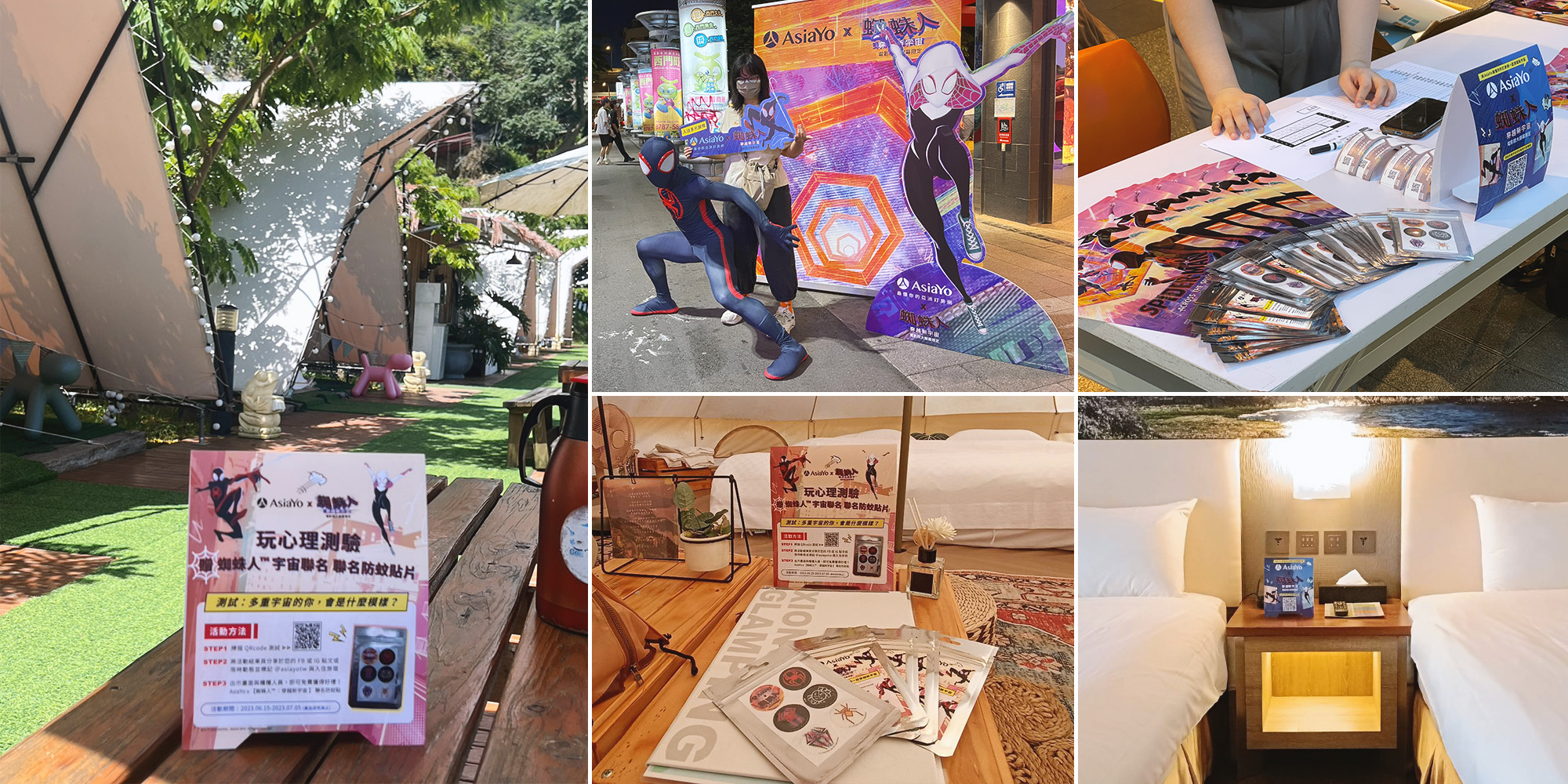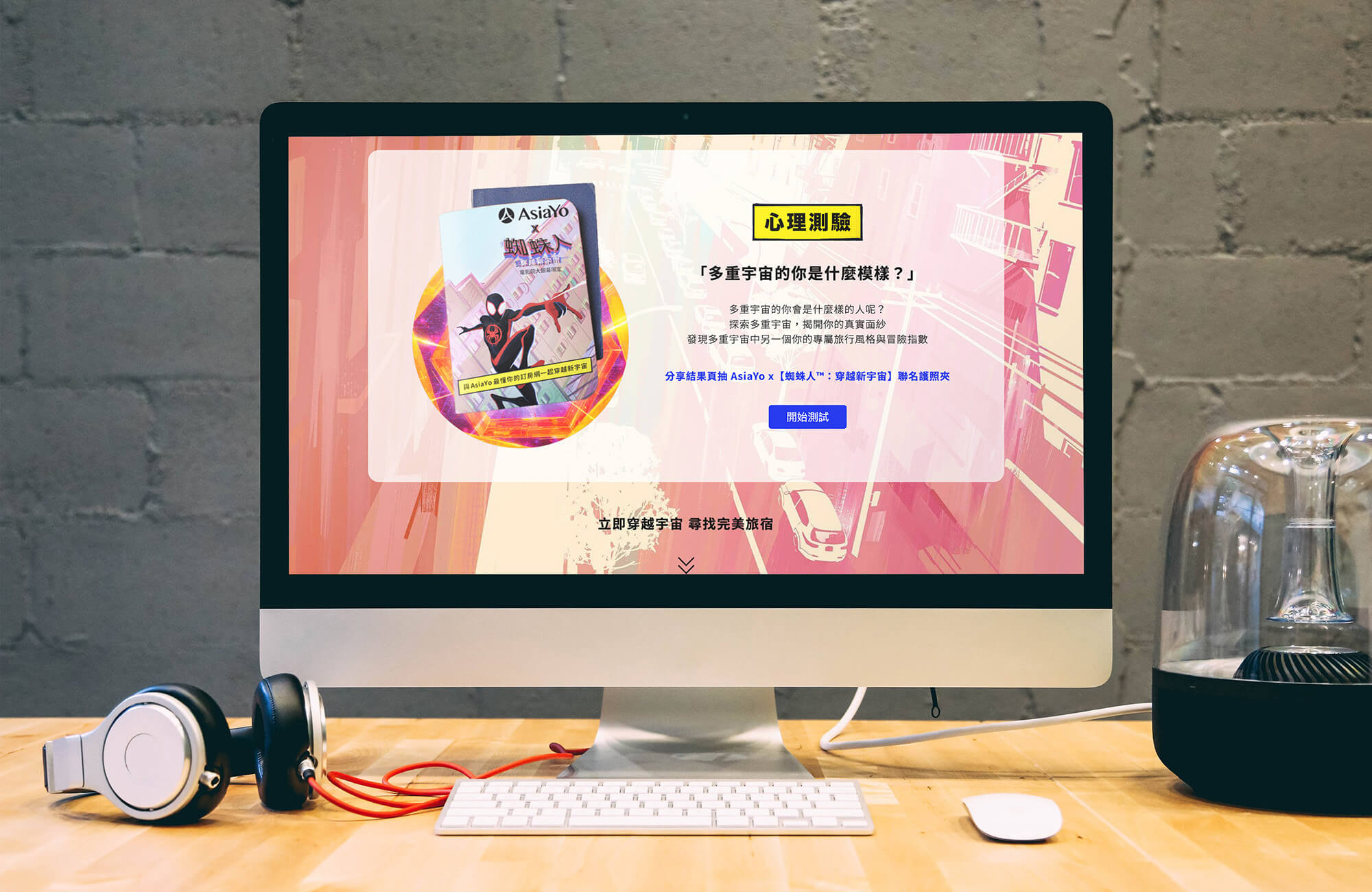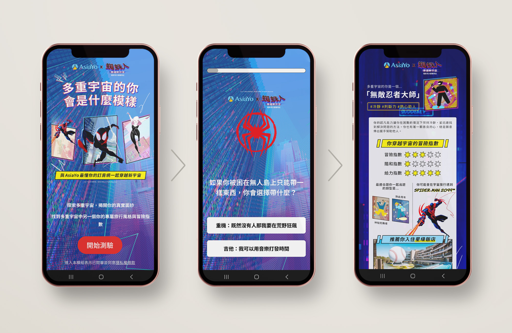 活動主軸除了串連線下旅宿優惠外,並利用心理測驗活動,擴大觸及用戶,參與心理測驗並分享可以抽 AsiaYo x 蜘蛛人™ 的護照套。