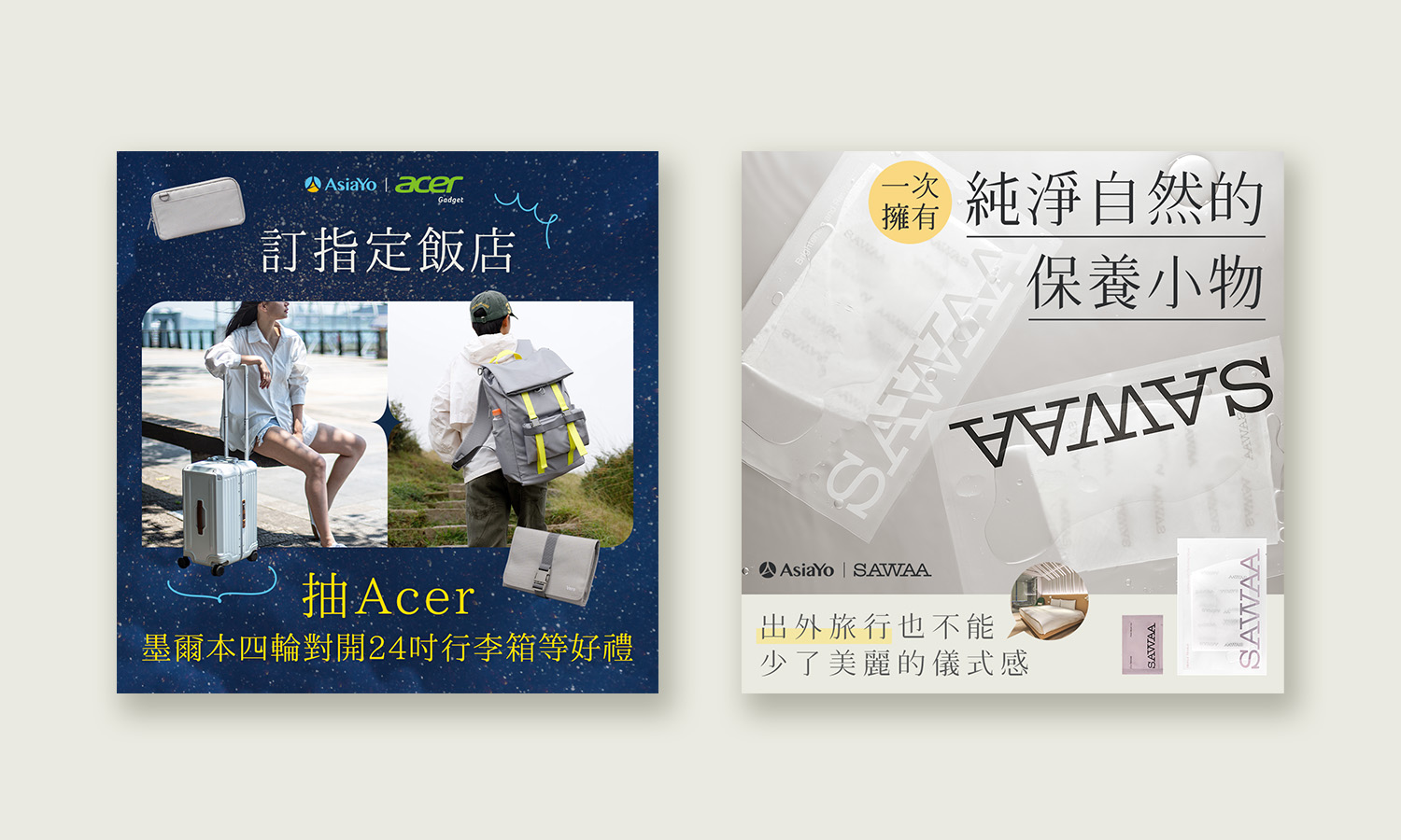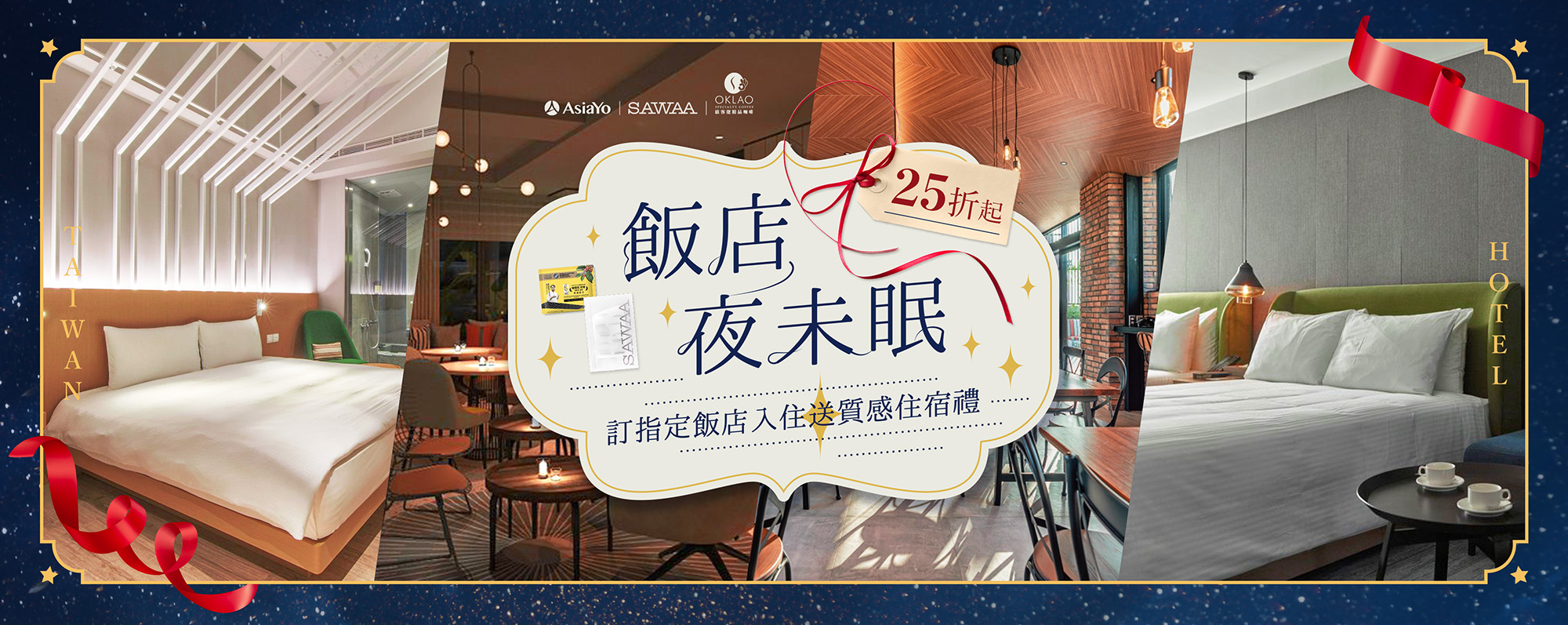 以推薦台灣城市飯店/商務旅館為主的優惠活動,訂房除享優惠外還能獲得質感住宿禮。 整體視覺主要以飯店旅宿照為主,並以夜晚的深藍色調搭配紅色,營造有質感的氛圍。