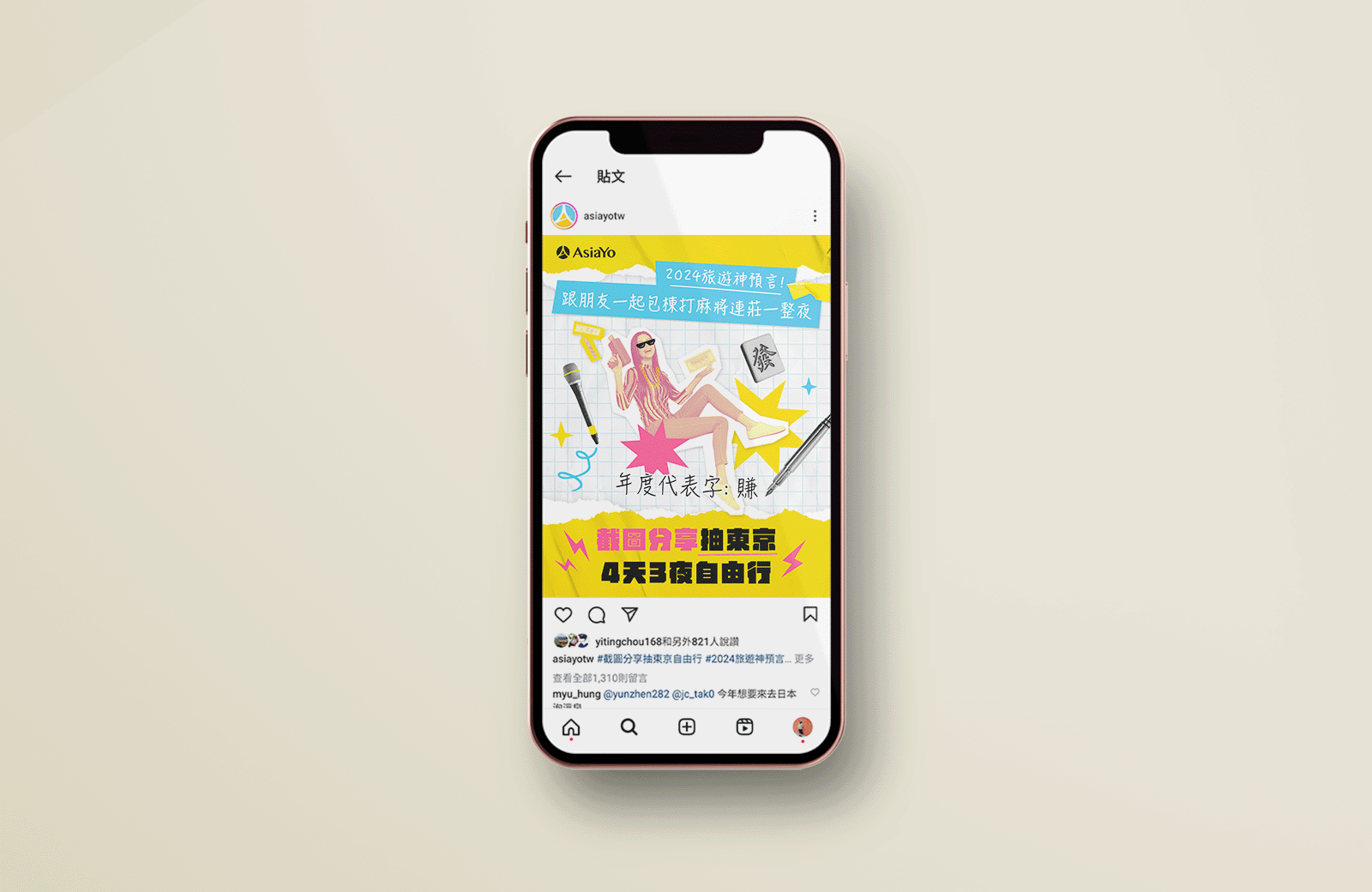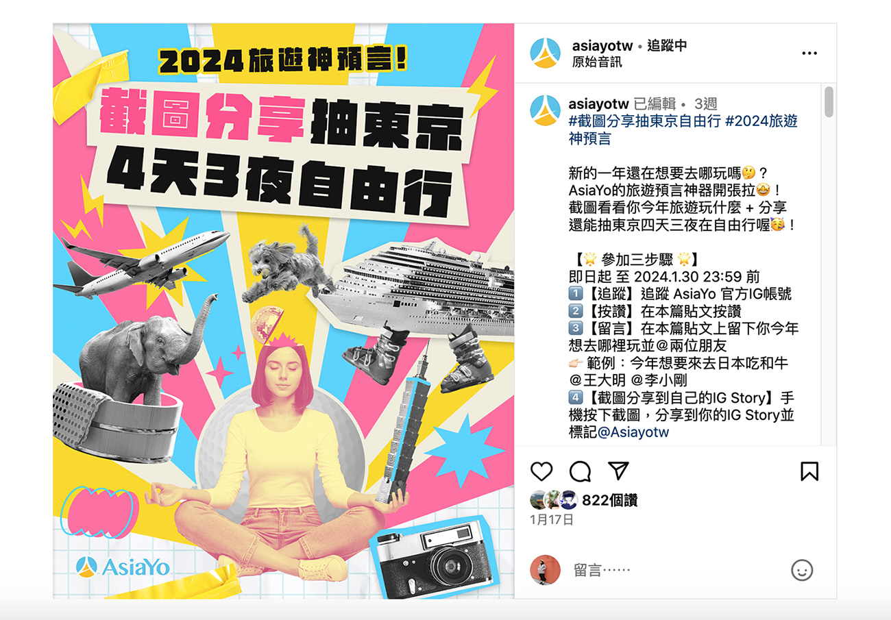 2024 AsiaYo 的線上品牌活動,以IG作為曝光渠道,以有趣的內容吸引用戶參與。