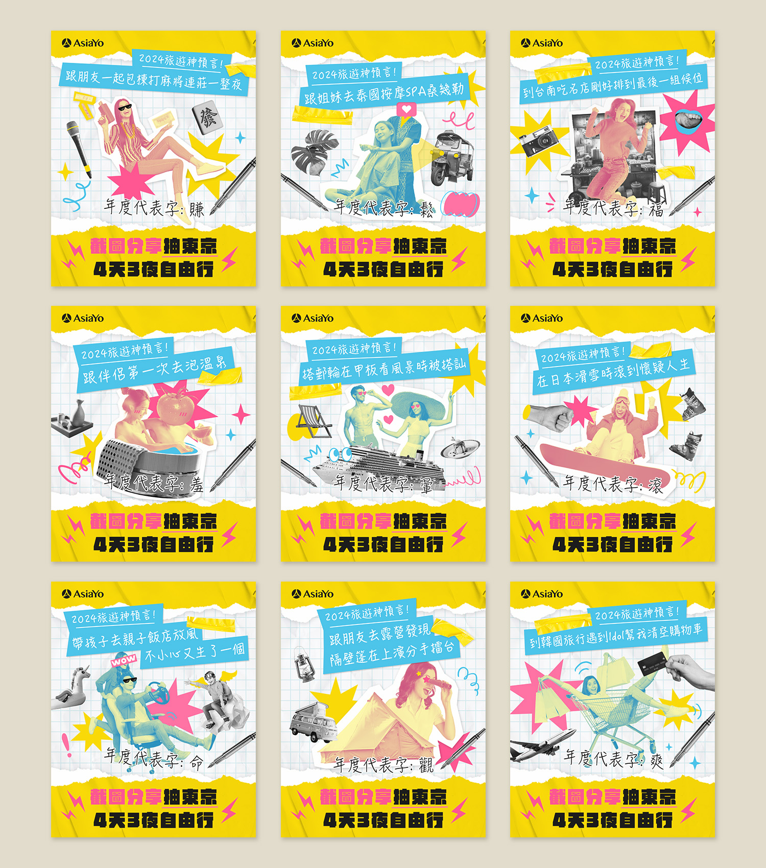嘗試用拼貼風的方式設計,用各式各樣的AsiaYo的特色旅宿及販售商品做剪貼圖樣,視覺配色用繽紛的黃、藍、粉營造熱鬧吸睛的氛圍。