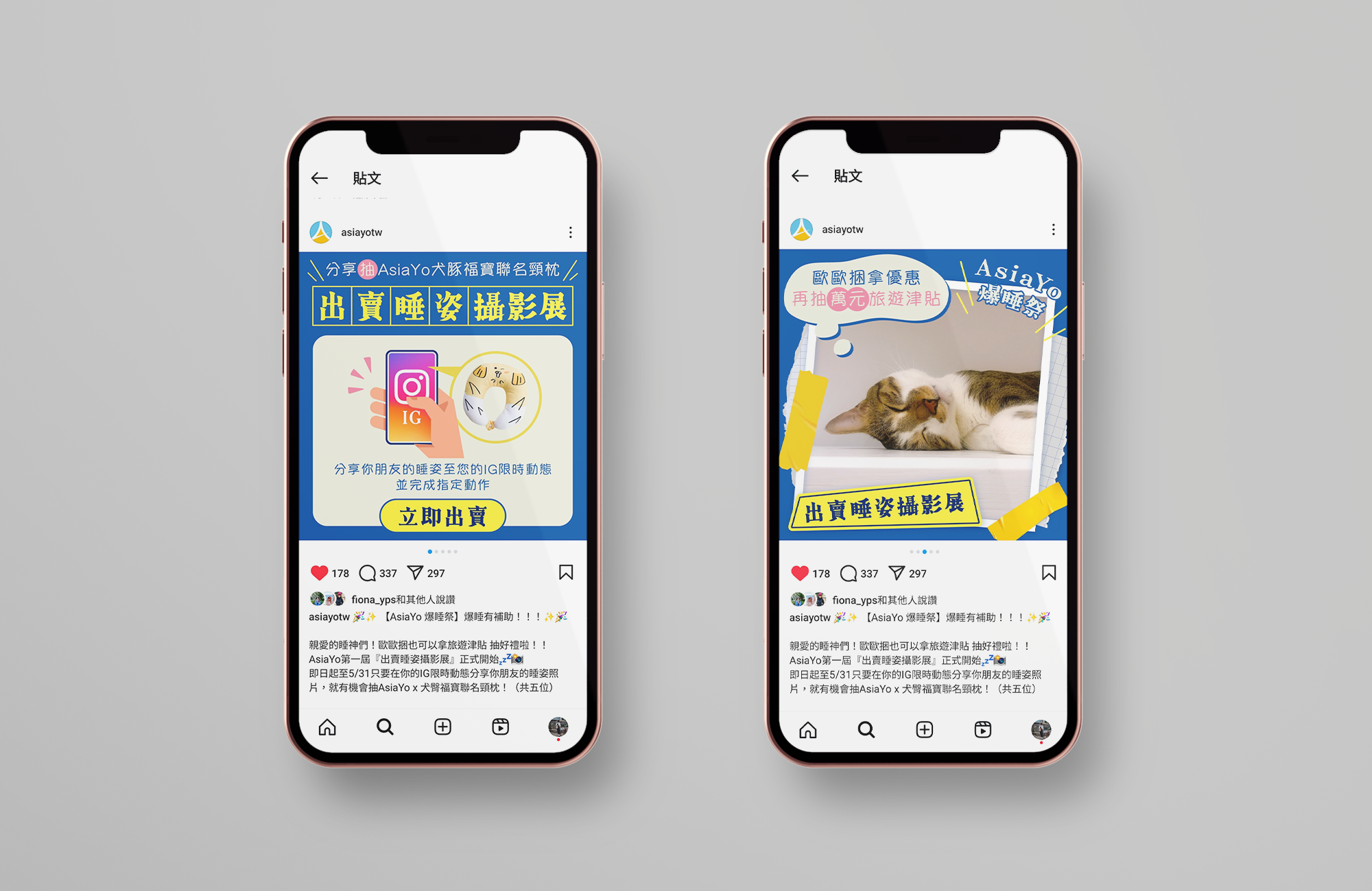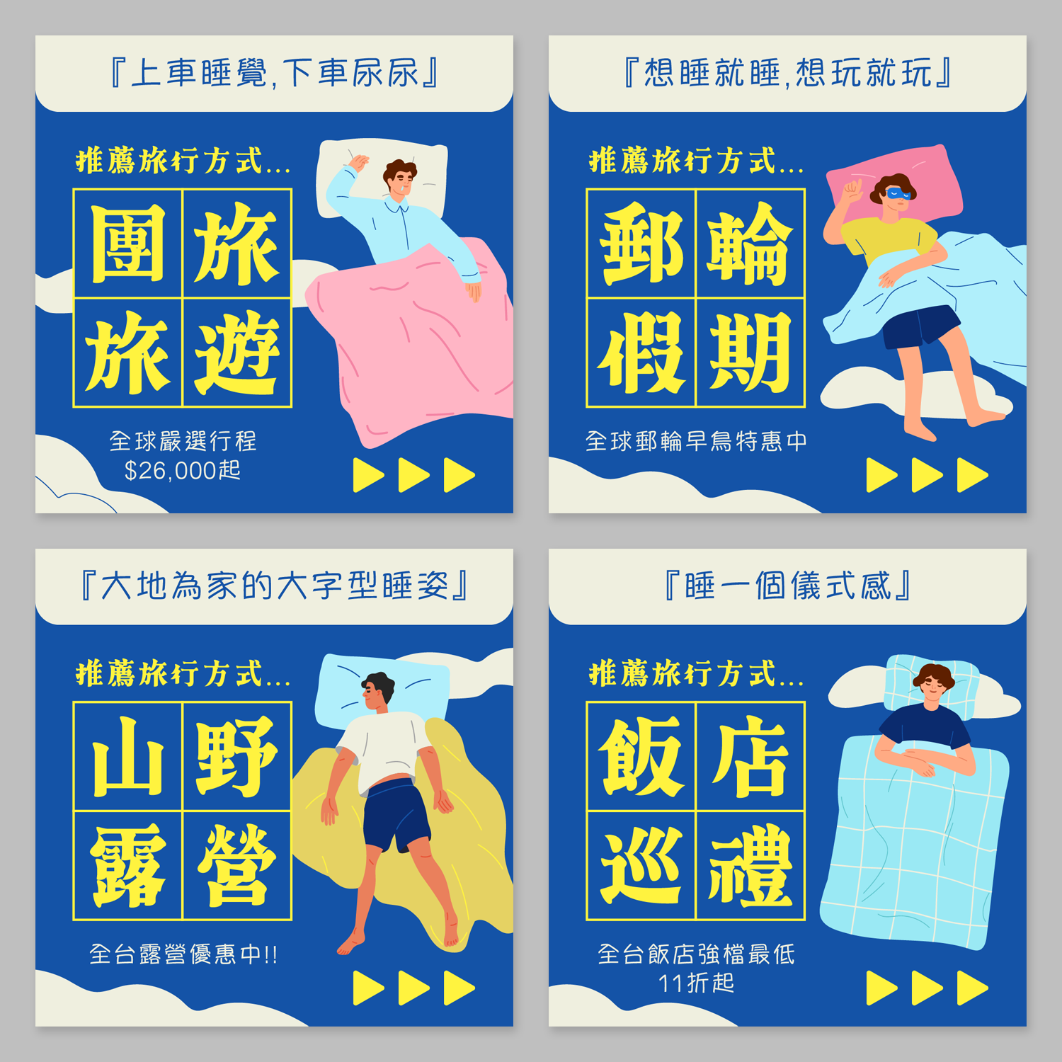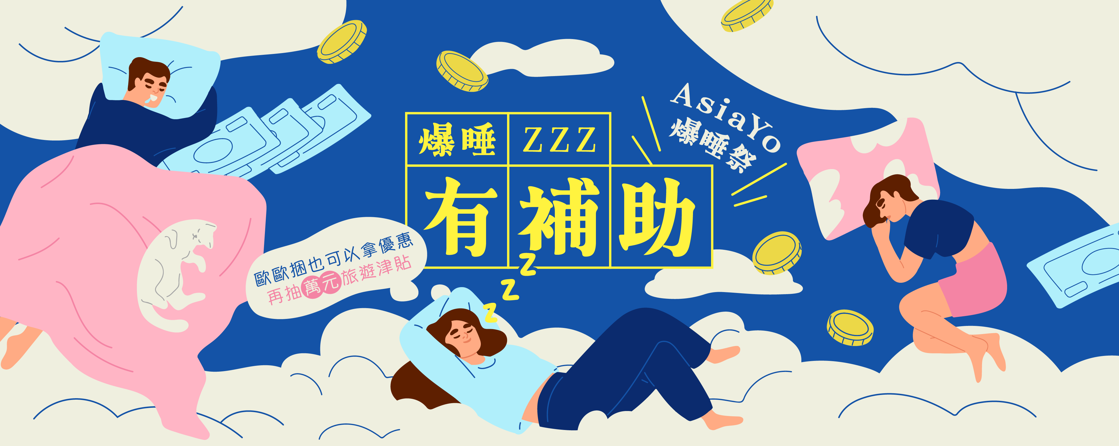 AsiaYo 2024 五月的品牌活動以「爆睡」為包裝主題,諧音自”報稅季”,用各式各樣的睡法結合 AsiaYo 的商品;視覺使用讓人聯想到睡眠也代表品牌的藍色,並搭配粉色及黃色讓整體視覺不過於黯淡。