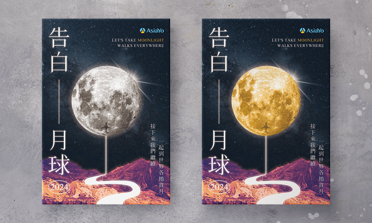 AsiaYo 2024的中秋賀卡,主題「告白月球」靈感來自有名的歌曲—告白氣球,以圓月結合飛機的速度線,想表達氣球的意向, 月亮有金/銀兩款設計。