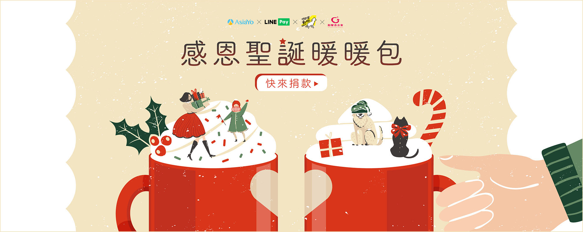 2020 AsiaYo 的聖誕節公益捐款活動,活動期間只要捐款100元給指定的親子或寵物公益團體,就可以拿到100元的LINE POINTS折價券。 設計靈感源自於冬日想要來一杯暖呼呼的熱飲,想傳達您的捐款可以在冬日溫暖他人的心的意象。