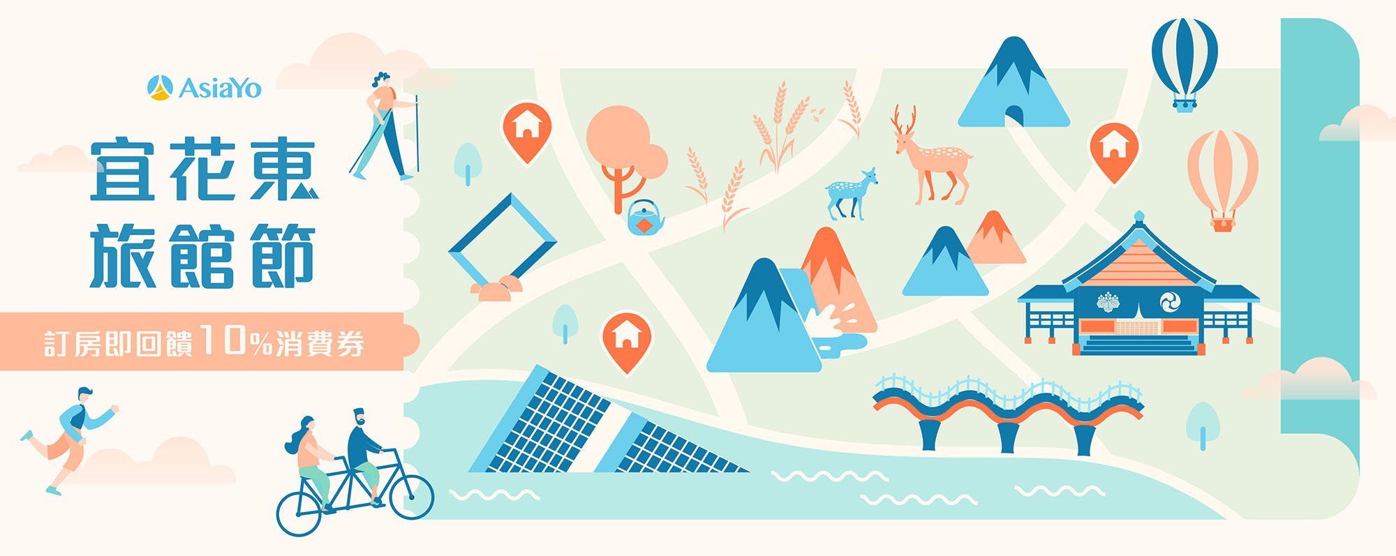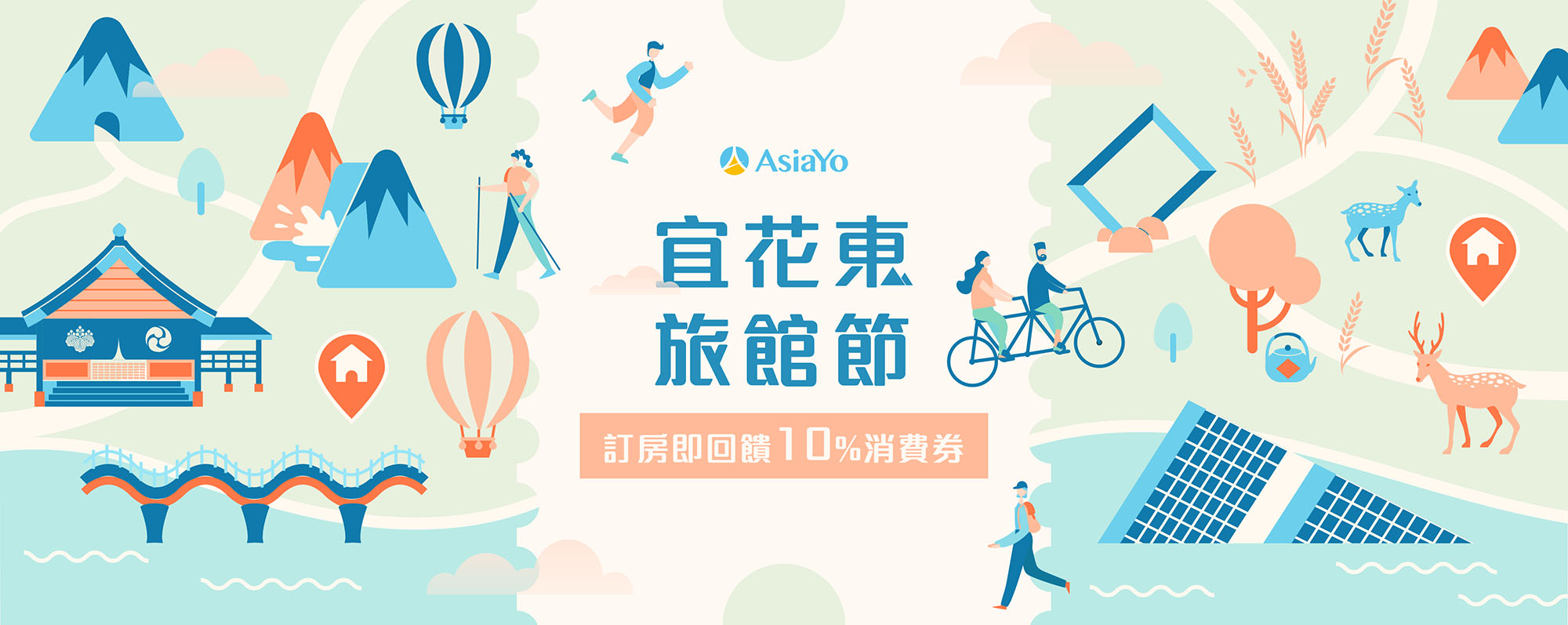 透過 AsiaYo 下訂宜花東有配合活動之旅宿,即可獲得10%電子消費券的回饋,主視覺設計從票券延伸到各個宜花東旅遊景點,如:蘭陽博物館、熱氣球、三仙台等,希望給人輕鬆愉快的出遊氛圍。