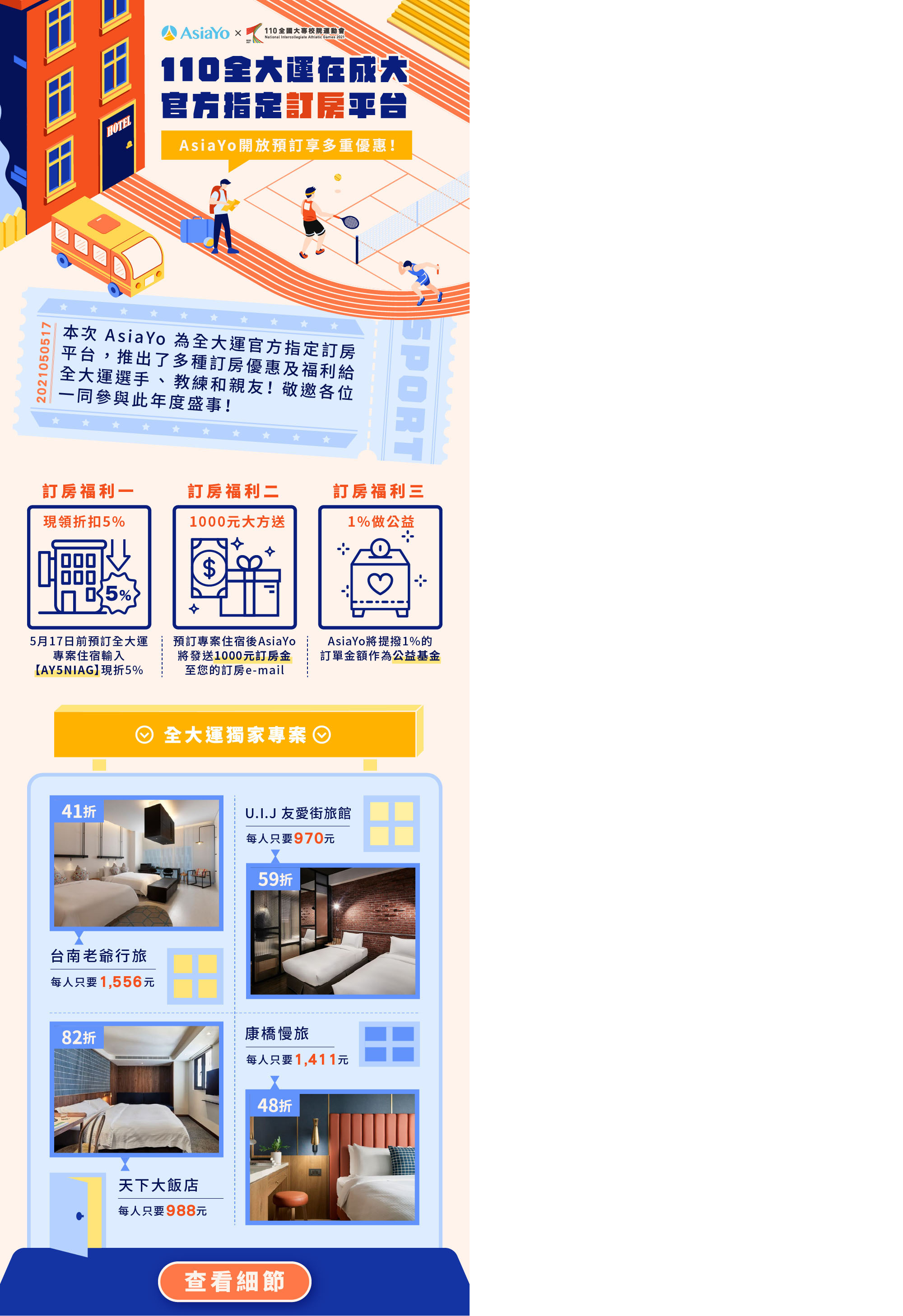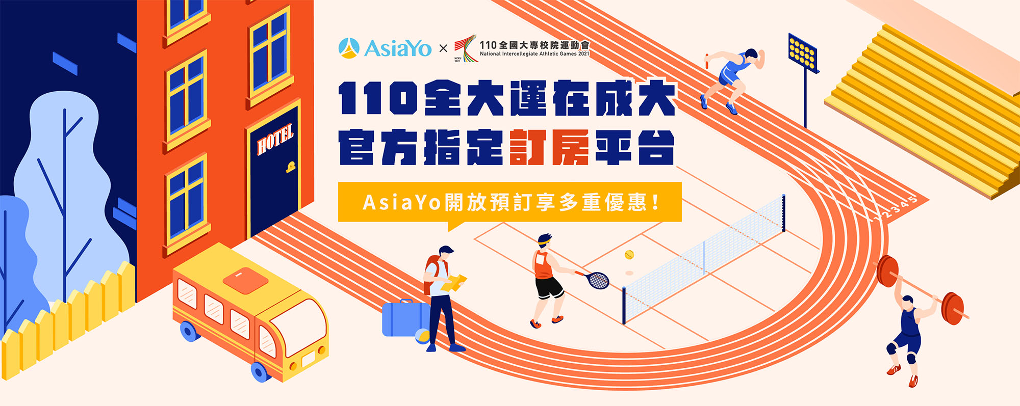 替110年全國大專校院運動會的指定訂房平台 AsiaYo 所作的宣傳Banner,設計上將旅館結合運動跑道,並使用橘色及藍色想表達出有運動感的活力氛圍,讓觀看者可以聯想到住宿及賽事。